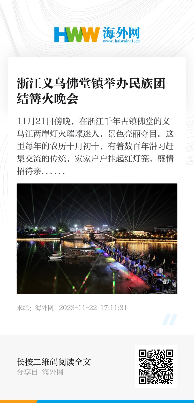 11月21日傍晚,在浙江千年古镇佛堂的义乌江两岸灯火璀璨迷人,景色亮丽夺目。这里每年的农历十月初十,有着数百年沿习赶集交流的传统,家家户户挂起红灯笼,盛情招待亲朋好友和南来北往的商客。今日,因疫情沉静了三年的义乌侬,还有众多来自五湖四海的民族兄弟姐妹,不约而同地相约佛堂镇,参加一场规模宏大的“中华民族一家亲·同心共筑中国梦”为主题的民族团结篝火晚会,用最传统的民俗“文化大餐”,载歌载舞,喜庆共富、祥和的“古镇之夜”。