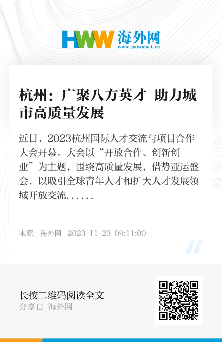 近日,2023杭州国际人才交流与项目合作大会开幕。大会以“开放合作、创新创业”为主题,围绕高质量发展,借势亚运盛会,以吸引全球青年人才和扩大人才发展领域开放交流为重点,助力浙江打造成为各类人才向往的科创高地,努力在以科技创新塑造发展新优势上走在前列。