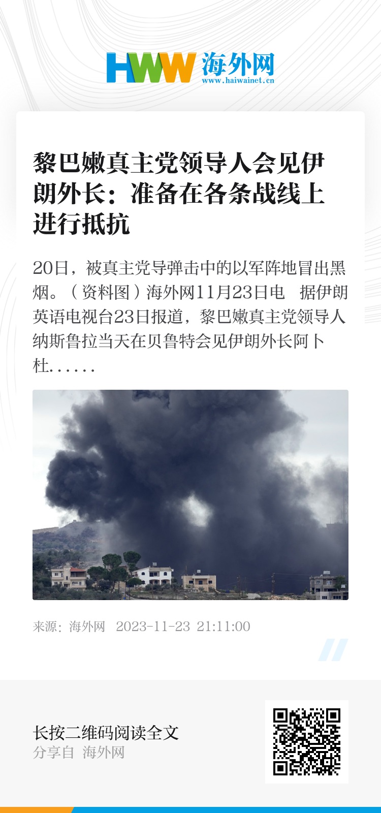 海外网11月23日电 据伊朗英语电视台23日报道,黎巴嫩真主党领导人纳斯鲁拉当天在贝鲁特会见伊朗外长阿卜杜拉希扬时表示“准备在各条战线上(对以色列)进行抵抗”。