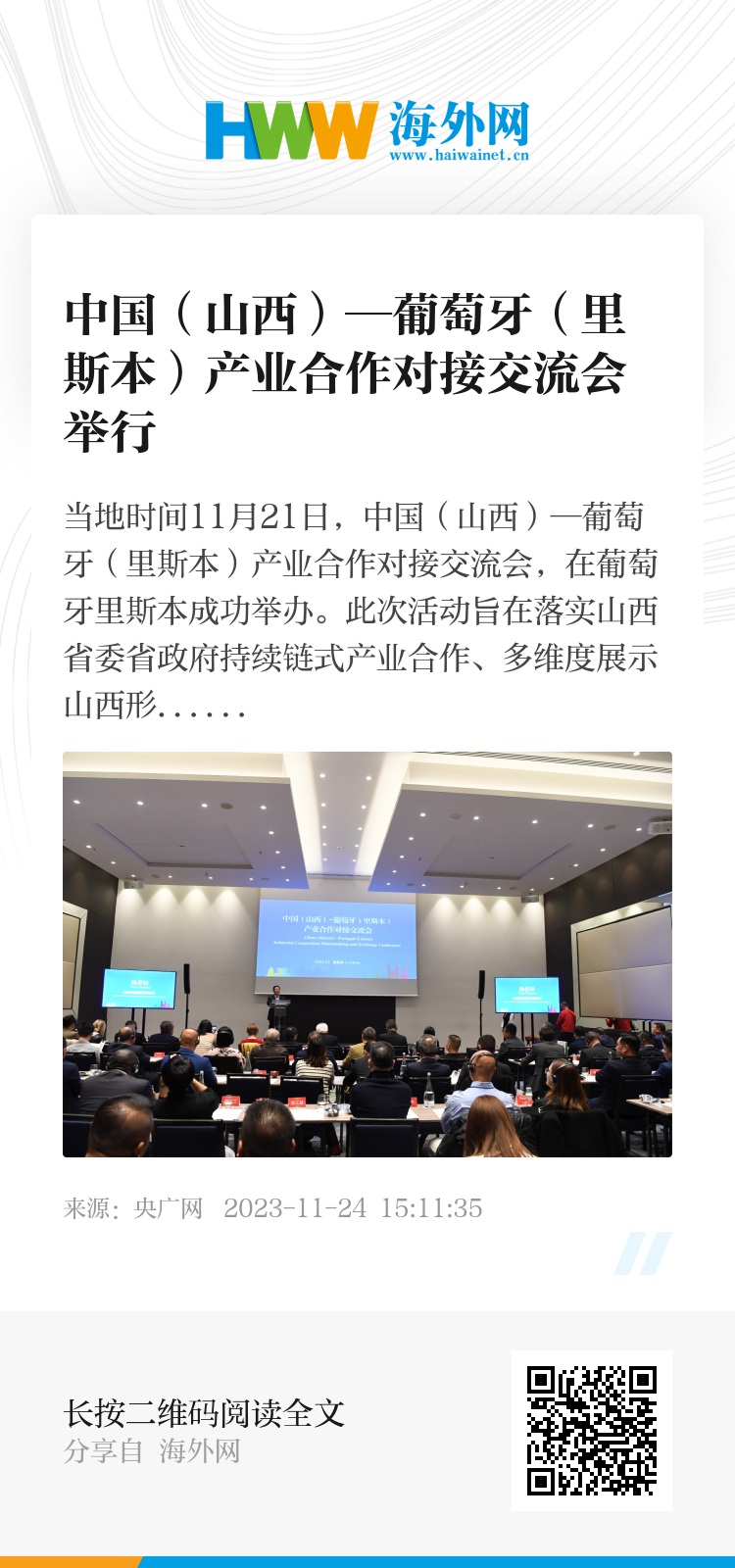 当地时间11月21日,中国(山西)—葡萄牙(里斯本)产业合作对接交流会,在葡萄牙里斯本成功举办。此次活动旨在落实山西省委省政府持续链式产业合作、多维度展示山西形象、扩大境外“朋友圈”。本次交流会邀请到两国商界代表等约80余人参加,大家互动交流、洽谈对接,共叙友谊、共商合作。