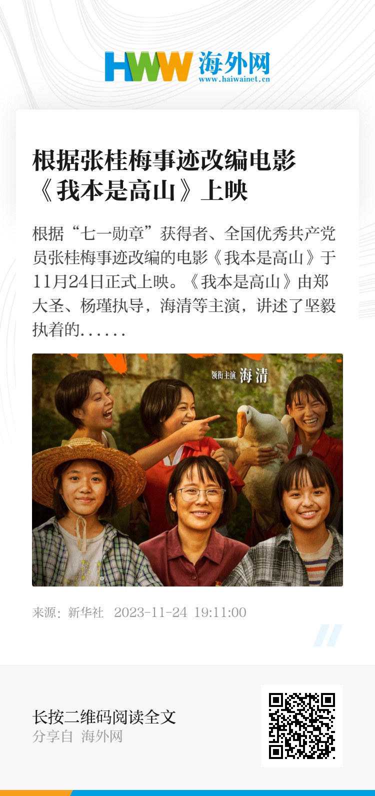 根据“七一勋章”获得者、全国优秀共产党员张桂梅事迹改编的电影《我本是高山》于11月24日正式上映。