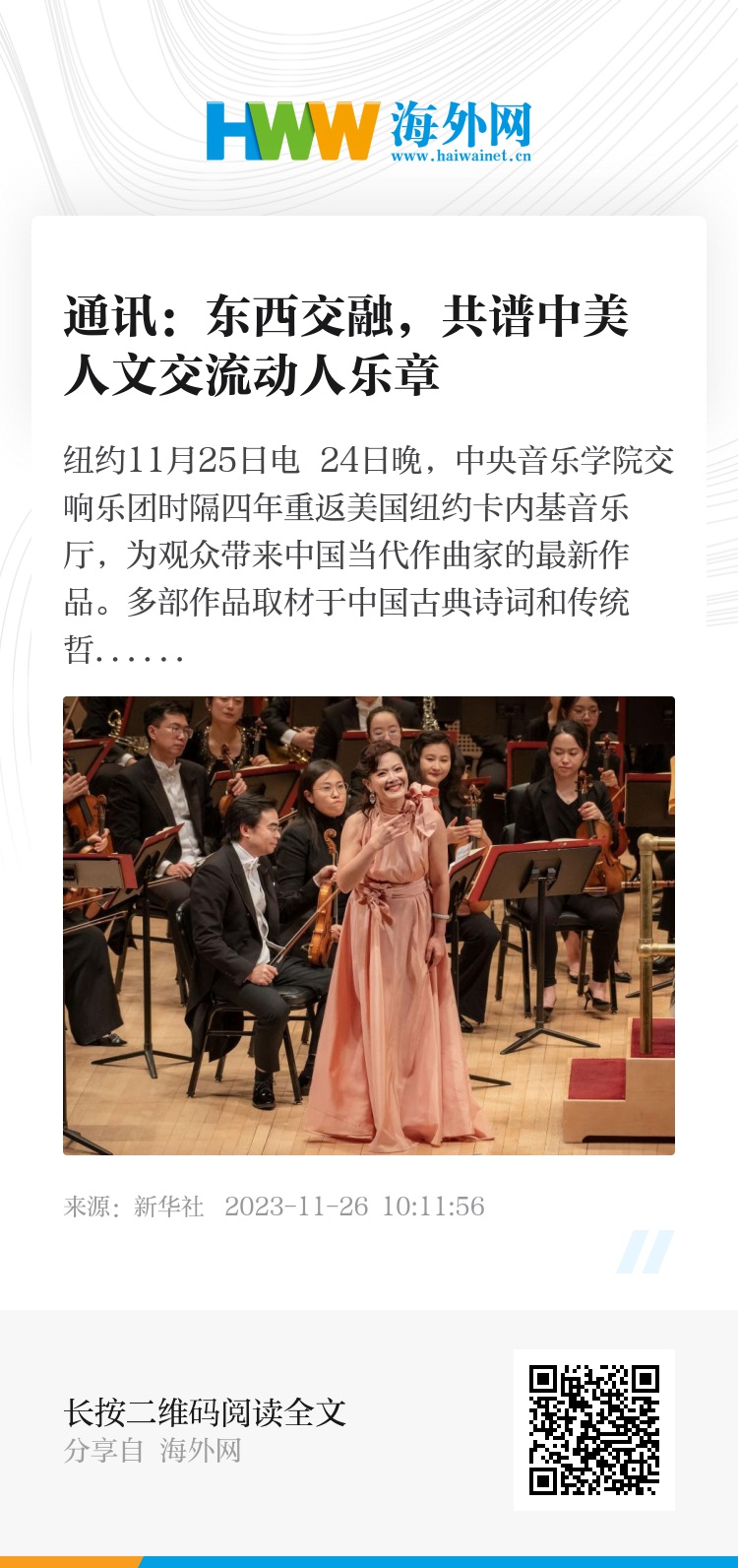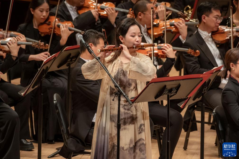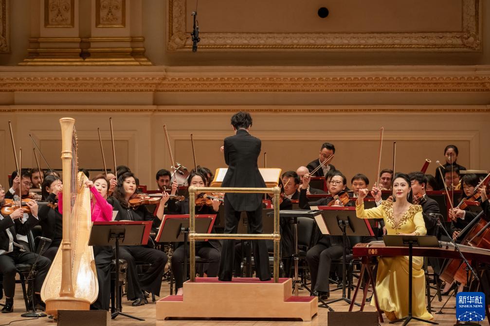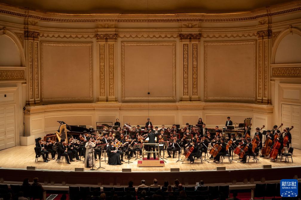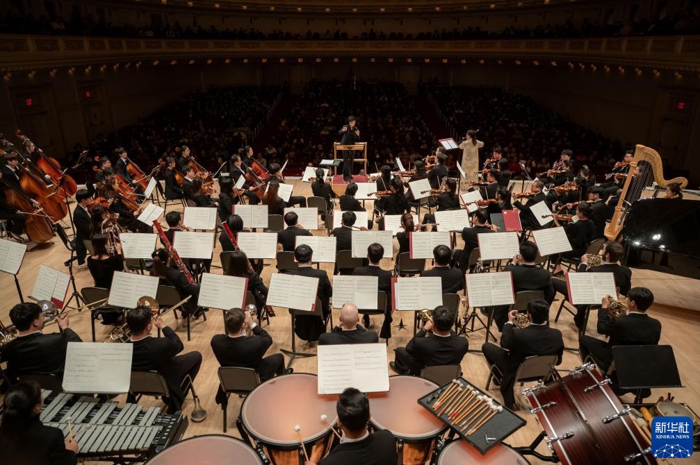 新华社纽约11月25日电 24日晚,中央音乐学院交响乐团时隔四年重返美国纽约卡内基音乐厅,为观众带来中国当代作曲家的最新作品。多部作品取材于中国古典诗词和传统哲学著作,展现出古筝、竹笛等中国传统民族乐器与西洋乐器的碰撞,奏响东西方文化交融的动人乐章。