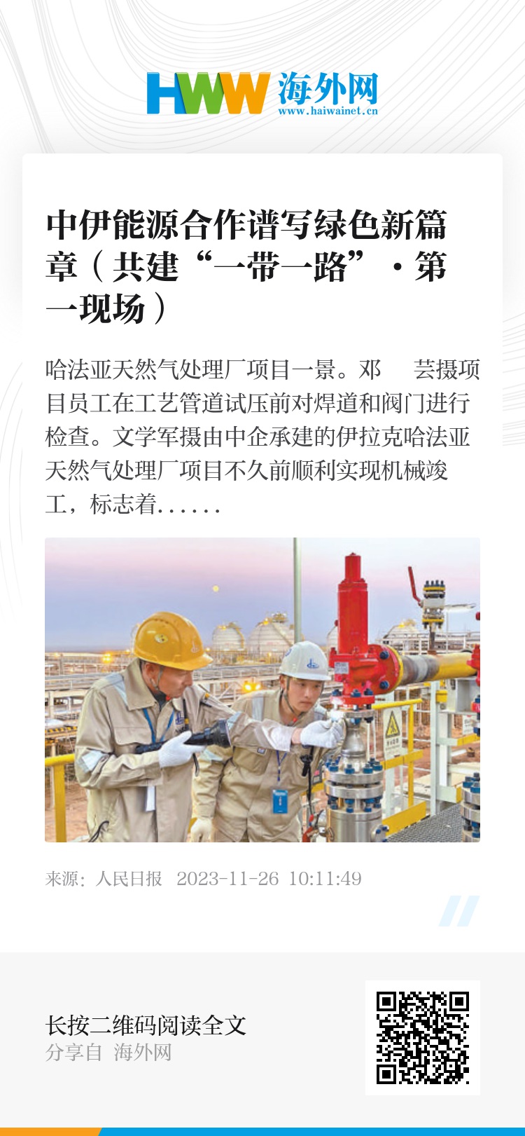“我的朋友都很羡慕我能在中国企业工作。”项目伊拉克籍工程师纳沙阿特说,中国企业提供规范的培训学习方案,面对困难时同事们总是相互帮助,毫无保留地传授经验。他说,哈法亚天然气处理厂项目既涉及发电用气供给,又能为当地带来更多经济和生态效益,当地民众十分关注项目建设进展。“加入中国企业以来,我对共建‘一带一路’有了更多了解。伊中合作项目不仅改善了我们的生活,更重要的是让我们的未来发展有了更多可能。”