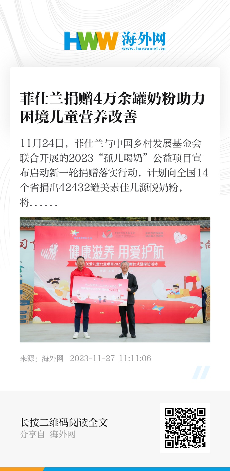 11月24日,菲仕兰与中国乡村发展基金会联合开展的2023“孤儿喝奶”公益项目宣布启动新一轮捐赠落实行动,计划向全国14个省捐出42432罐美素佳儿源悦奶粉,将助力8000余名乡村孤儿和困境儿童的营养状况改善。捐赠仪式在受助地之一的贵州关岭布依族苗族自治县举办,中国乡村发展基金会副理事长陈志刚、荷兰皇家菲仕兰中国高级副总裁杨国超、关岭布依族苗族自治县委常委胡一平等出席活动。