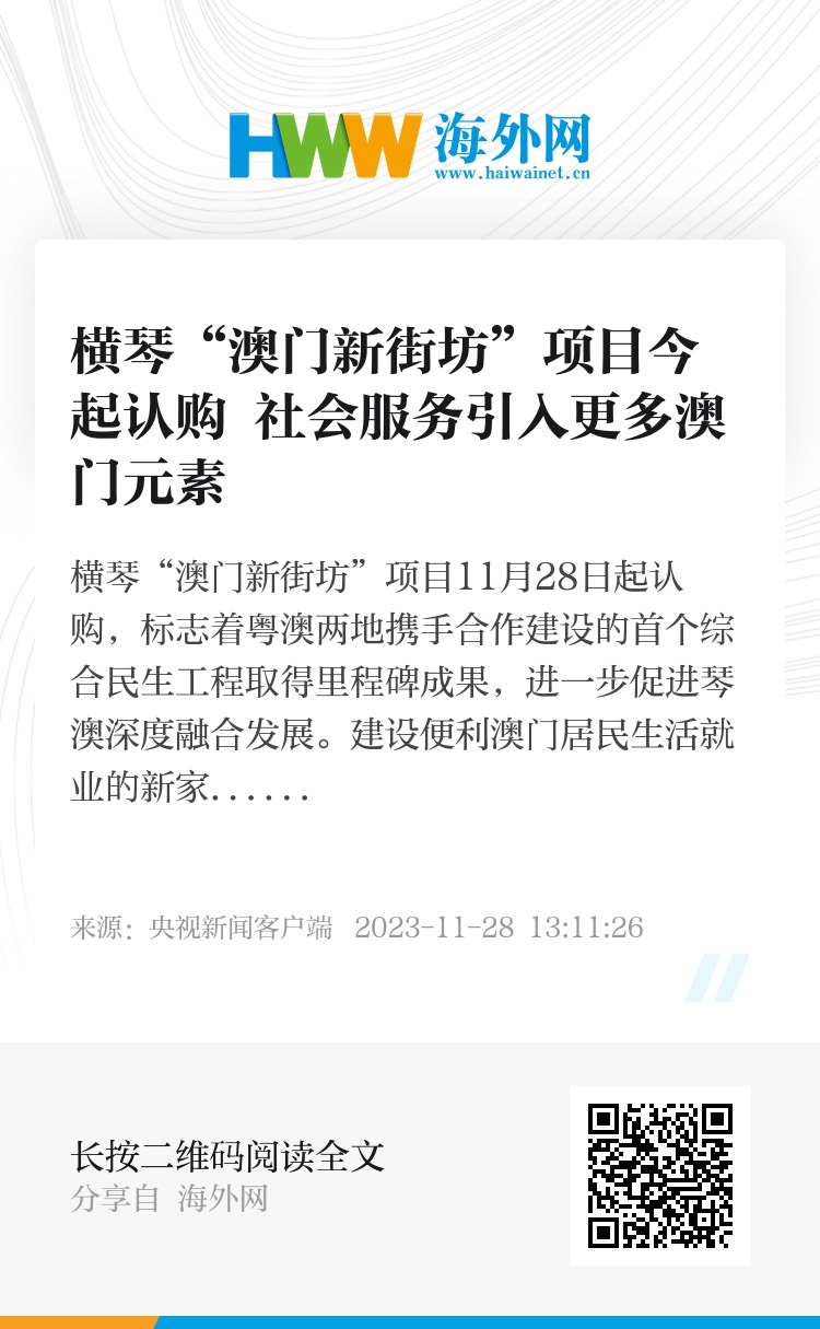 横琴“澳门新街坊”项目11月28日起认购,标志着粤澳两地携手合作建设的首个综合民生工程取得里程碑成果,进一步促进琴澳深度融合发展。