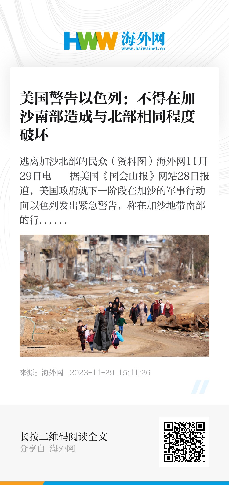 海外网11月29日电 据美国《国会山报》网站28日报道,美国政府就下一阶段在加沙的军事行动向以色列发出紧急警告,称在加沙地带南部的行动不得造成与该地区北部相同程度的破坏。