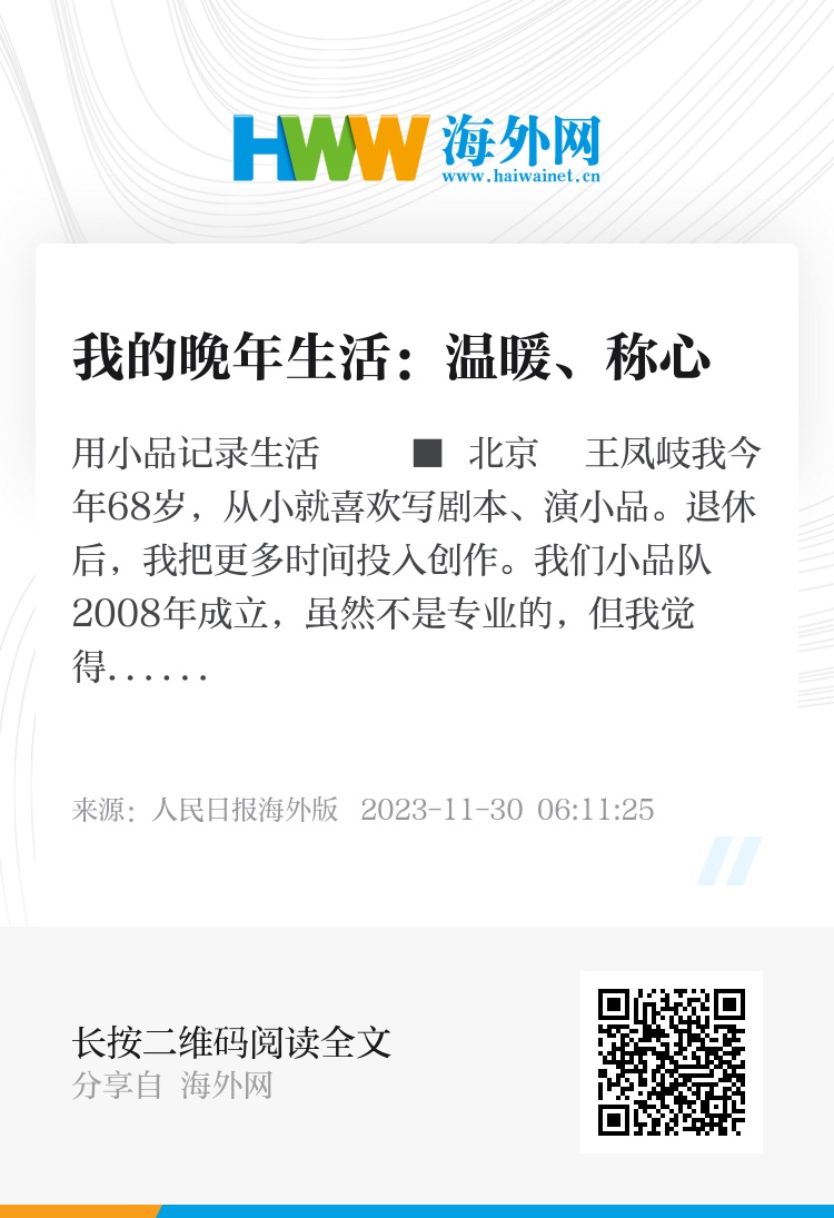 我今年68岁,从小就喜欢写剧本、演小品。退休后,我把更多时间投入创作。我们小品队2008年成立,虽然不是专业的,但我觉得把社区里看到的、听到的故事改编成小品,带着邻居把身边的事情表演出来,意义更大。