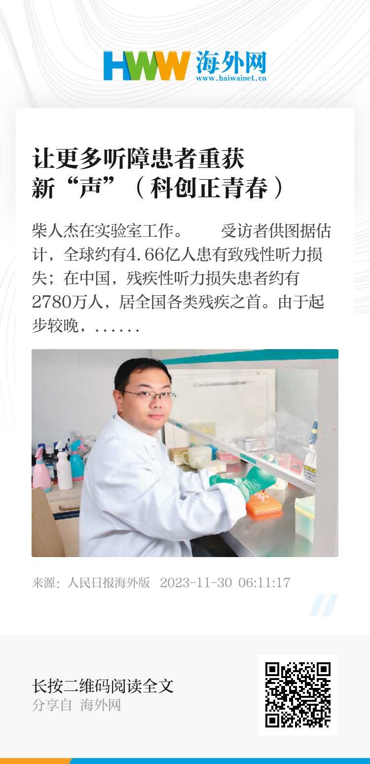 柴人杰说,刚回国工作时,实验室条件相对简陋,顶尖的检测设备、尖端实验原材料很难采购到。“这些年,国家千方百计为我们提供科研支持,让科研人的信心和底气越来越足。”柴人杰说,在科技部国家重点研发计划、中科院A类战略性先导科技专项、国家自然科学基金重点项目等多项国家级重大项目的支持下,他率领的研究团队在内耳器官的再生和保护研究方面不断取得进展。