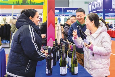 日前举行的第九届中国·内蒙古进出口商品博览会上,参观者在挑选法国红酒。