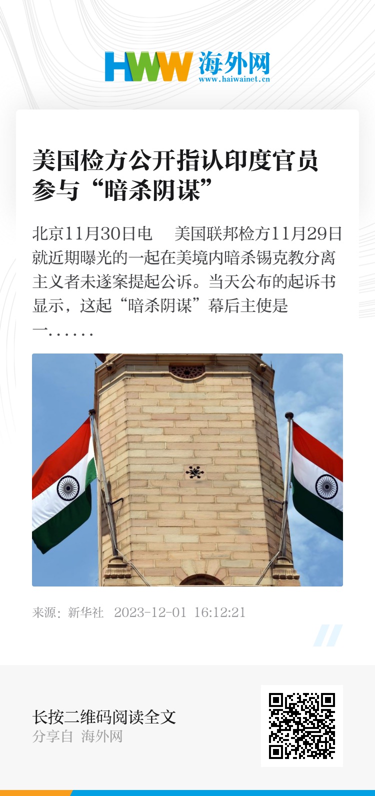 《金融时报》11月22日披露,美国当局挫败了这起“暗杀阴谋”,并就印度政府可能卷入其中向印方发出警告。