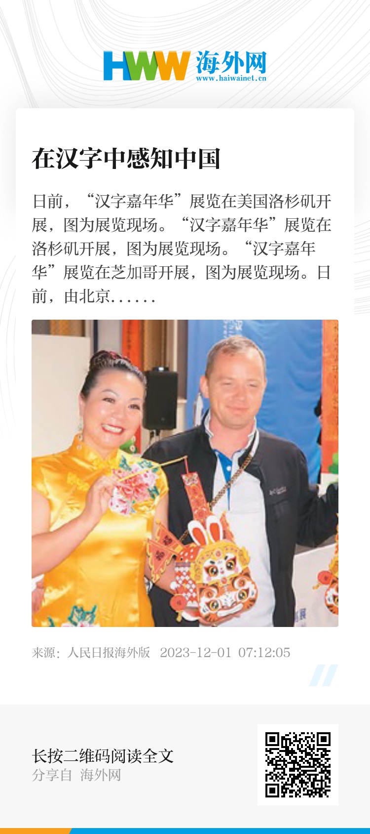 日前,由北京国际汉语研修学院等机构主办的2023“汉字嘉年华”海外巡展在美国芝加哥和洛杉矶相继开展,吸引了不少当地民众前来观展。