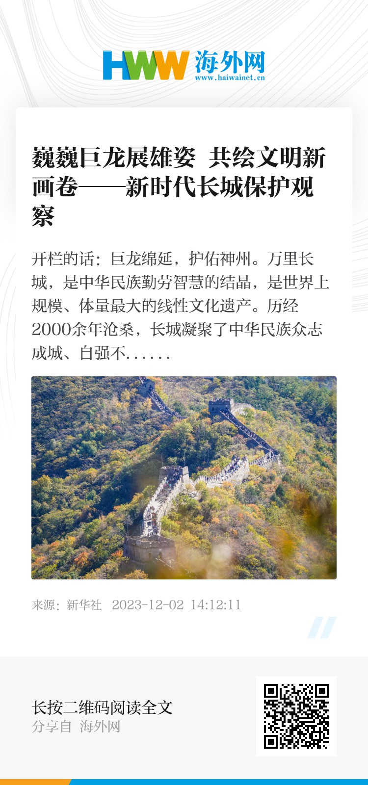 新华社即日起推出“新时代中国调研行·长城篇”行进式报道,全景展示长城内外华夏大地的新发展、新变化。