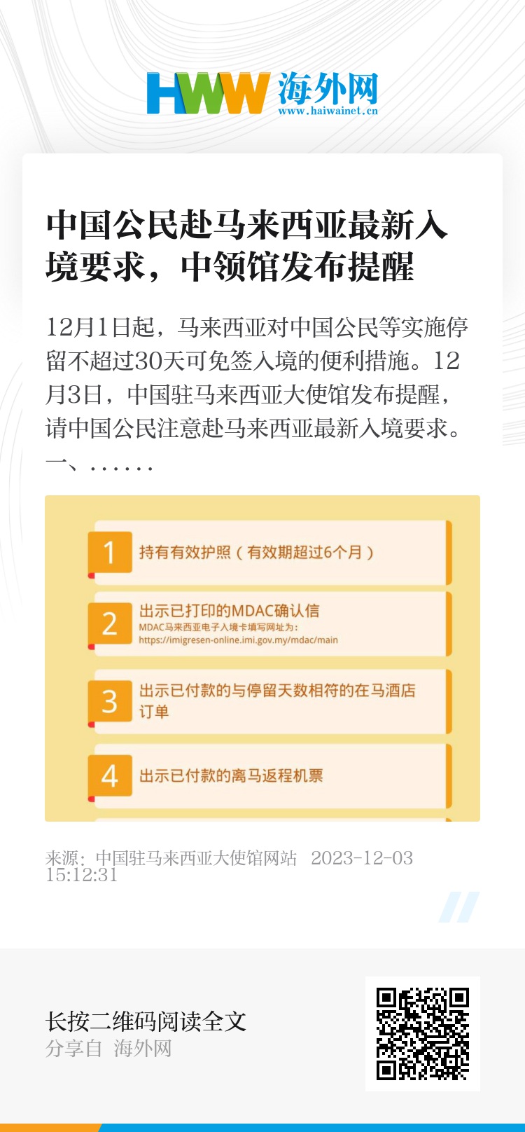 12月1日起,马来西亚对中国公民等实施停留不超过30天可免签入境的便利措施。12月3日,中国驻马来西亚大使馆发布提醒,请中国公民注意赴马来西亚最新入境要求。