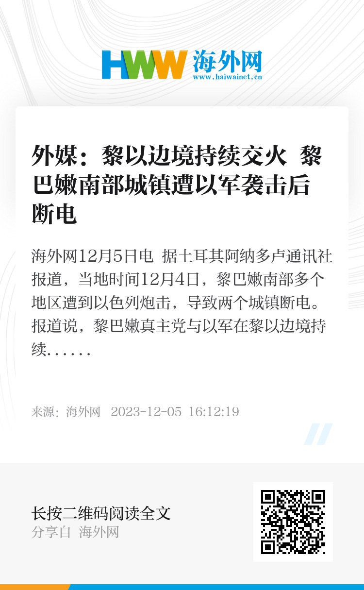 报道说,黎巴嫩真主党与以军在黎以边境持续交火。以军于4日发射炮弹击中了德尔米玛斯镇和卡法尔基拉镇的高压输电线路,导致两个镇完全断电。
