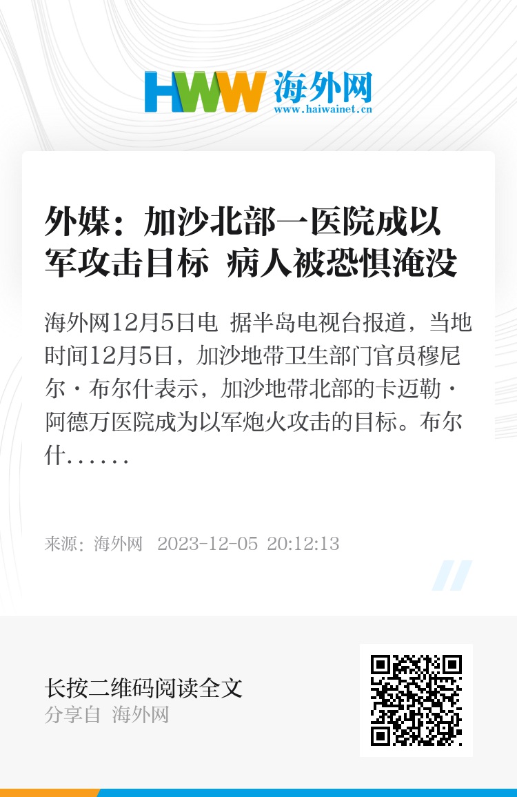 海外网12月5日电 据半岛电视台报道,当地时间12月5日,加沙地带卫生部门官员穆尼尔·布尔什表示,加沙地带北部的卡迈勒·阿德万医院成为以军炮火攻击的目标。