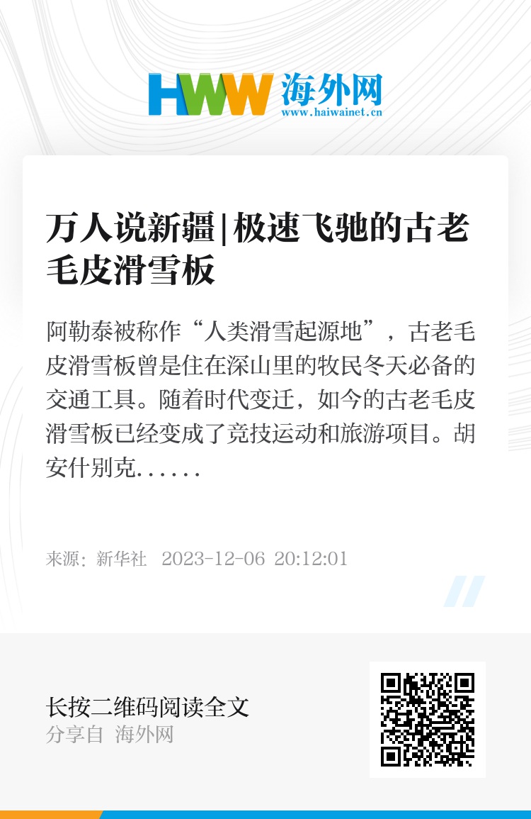 阿勒泰被称作“人类滑雪起源地”,古老毛皮滑雪板曾是住在深山里的牧民冬天必备的交通工具。随着时代变迁,如今的古老毛皮滑雪板已经变成了竞技运动和旅游项目。胡安什别克·斯兰别克来自新疆阿勒泰地区,是非物质文化遗产制作古老毛皮滑雪板的第五代传承人。他经常跟着父亲学习制作古老毛皮滑雪板,同时也积极向更多人介绍它的由来及演变,愿望是传承推广古老毛皮滑雪板的制作技艺和文化,让古老毛皮滑雪板登上更大的舞台。