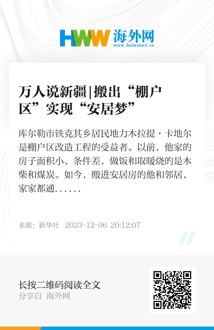 库尔勒市铁克其乡居民地力木拉提·卡地尔是棚户区改造工程的受益者。以前,他家的房子面积小、条件差,做饭和取暖烧的是木柴和煤炭。如今,搬进安居房的他和邻居,家家都通上了天然气、自来水、无线网络,有了独立卫生间。冬有地暖、夏有空调,小区周边商业街、文化馆、图书馆、科技馆一应俱全。这一切都让他们觉得很幸福。