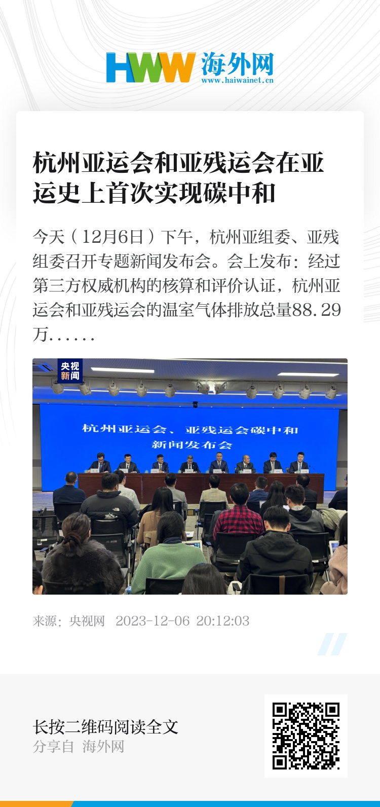 今天(12月6日)下午,杭州亚组委、亚残组委召开专题新闻发布会。会上发布:经过第三方权威机构的核算和评价认证,杭州亚运会和亚残运会的温室气体排放总量88.29万吨。截至目前,杭州亚组委接受社会各界捐赠的碳抵消指标达109.99万吨。碳抵消指标的数据超过本届亚运会、亚残会上的排放总量,实现了碳中和,这是亚运会历史上的首次。