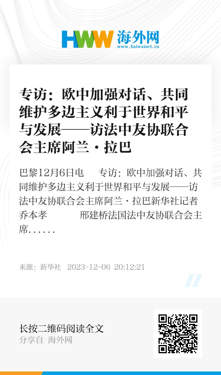 新华社巴黎12月6日电 专访:欧中加强对话、共同维护多边主义利于世界和平与发展——访法中友协联合会主席阿兰·拉巴