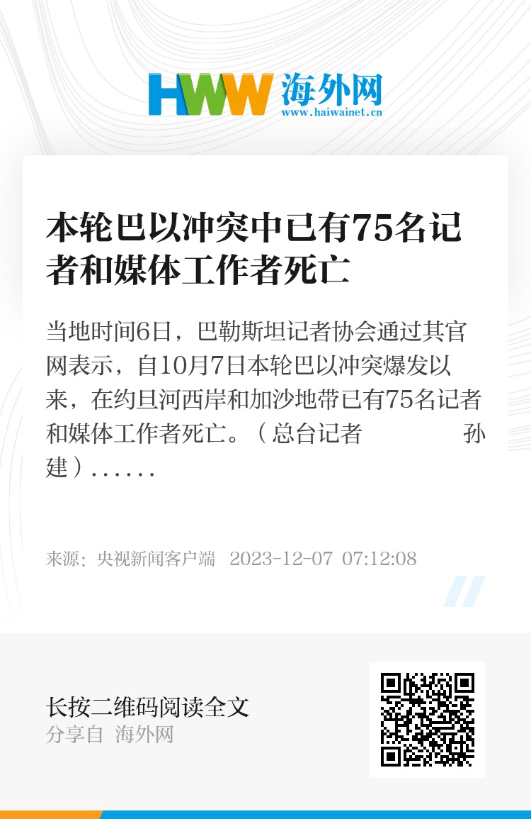 当地时间6日,巴勒斯坦记者协会通过其官网表示,自10月7日本轮巴以冲突爆发以来,在约旦河西岸和加沙地带已有75名记者和媒体工作者死亡。(总台记者 孙建)