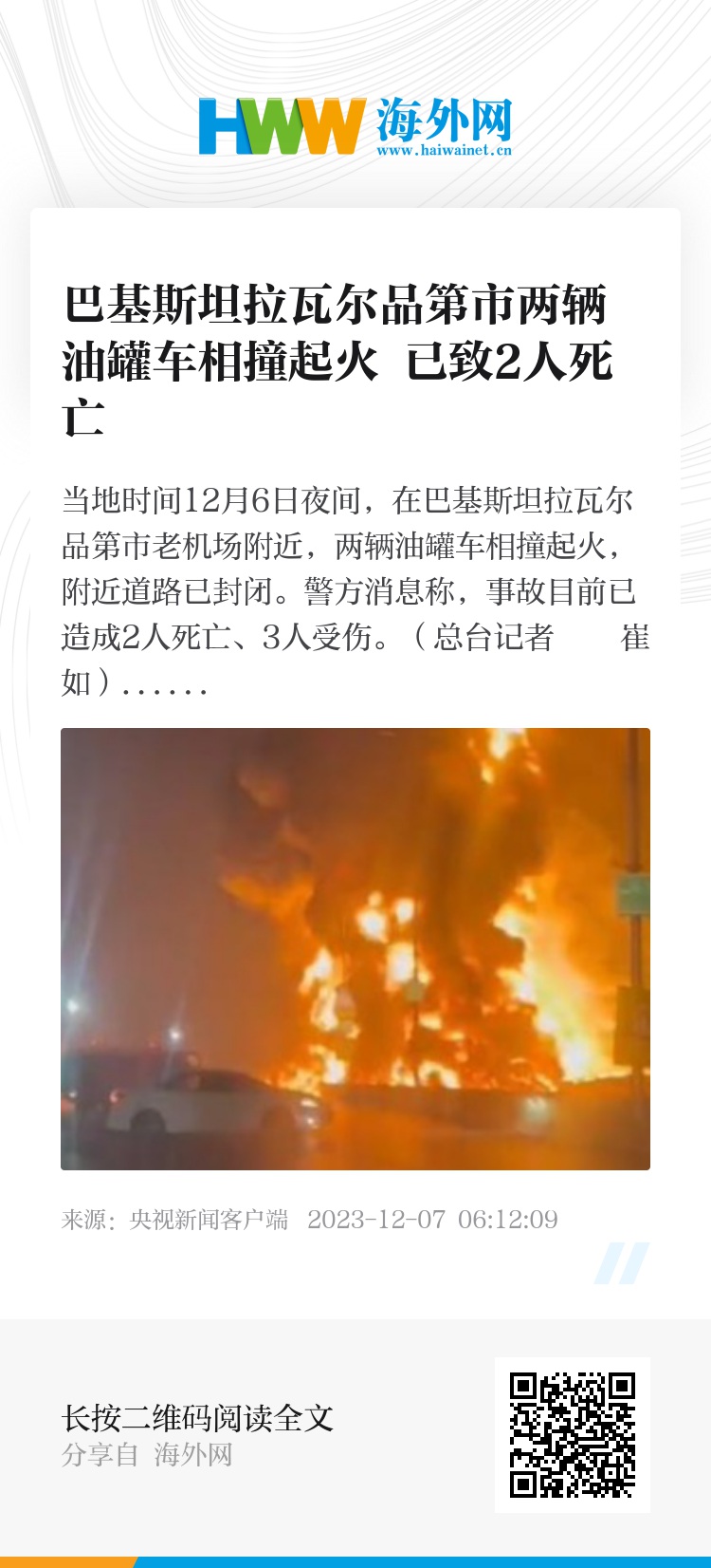 当地时间12月6日夜间,在巴基斯坦拉瓦尔品第市老机场附近,两辆油罐车相撞起火,附近道路已封闭。