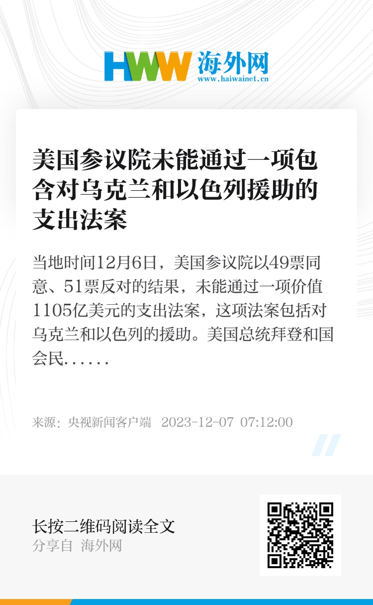 当地时间12月6日,美国参议院以49票同意、51票反对的结果,未能通过一项价值1105亿美元的支出法案,这项法案包括对乌克兰和以色列的援助。