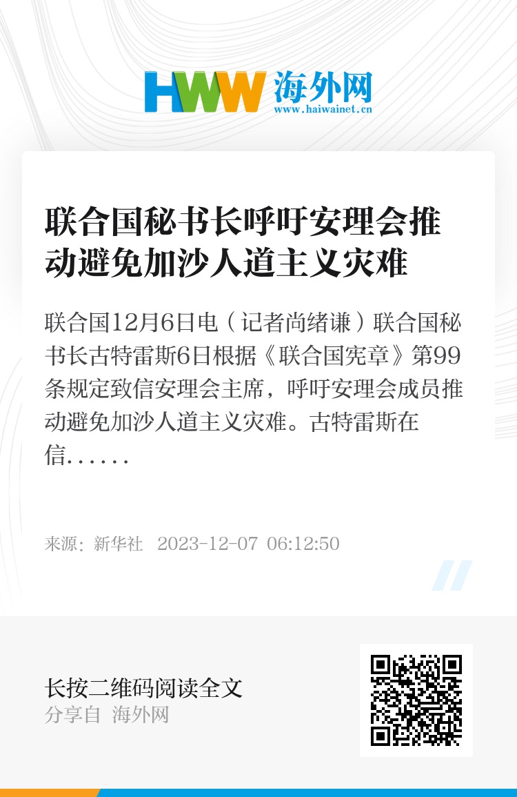 新华社联合国12月6日电(记者尚绪谦)联合国秘书长古特雷斯6日根据《联合国宪章》第99条规定致信安理会主席,呼吁安理会成员推动避免加沙人道主义灾难。