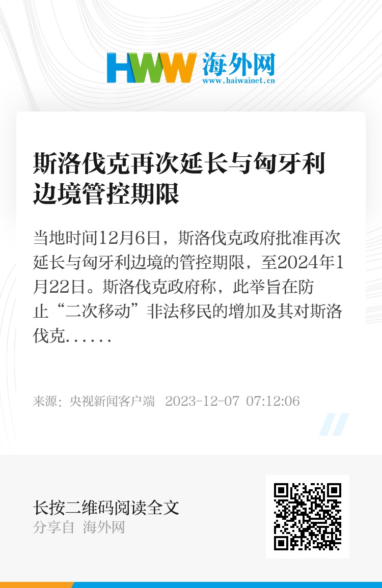 当地时间12月6日,斯洛伐克政府批准再次延长与匈牙利边境的管控期限,至2024年1月22日。