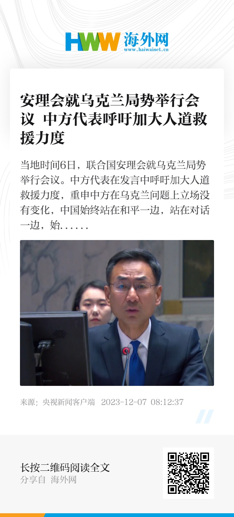 当地时间6日,联合国安理会就乌克兰局势举行会议。中方代表在发言中呼吁加大人道救援力度,重申中方在乌克兰问题上立场没有变化,中国始终站在和平一边,站在对话一边,始终致力于劝和促谈,尽快实现停火止战。