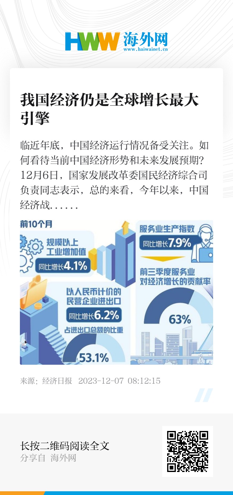 临近年底,中国经济运行情况备受关注。如何看待当前中国经济形势和未来发展预期?12月6日,国家发展改革委国民经济综合司负责同志表示,总的来看,今年以来,中国经济战胜困难挑战、顶住下行压力,经济恢复呈现波浪式发展、曲折式前进的特征,经济运行总体回升向好,今年对全球经济增长的贡献将达到三分之一,仍然是全球增长最大引擎。