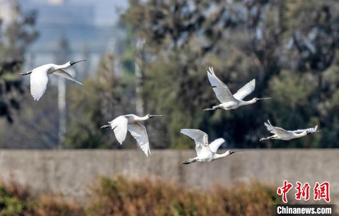 黑脸琵鹭在泉州泉港区滨海湿地飞翔。 庄绍坤 摄