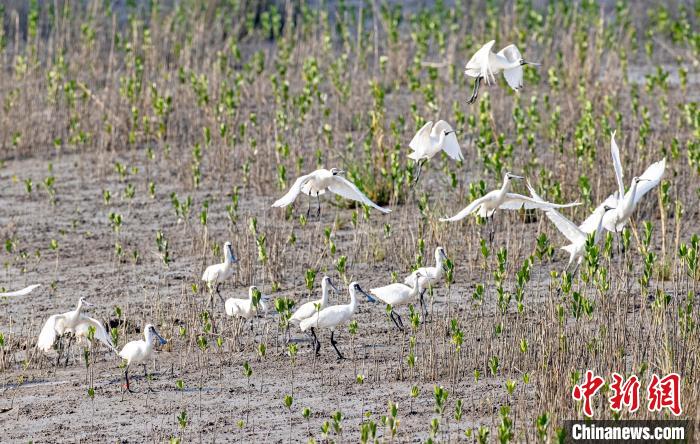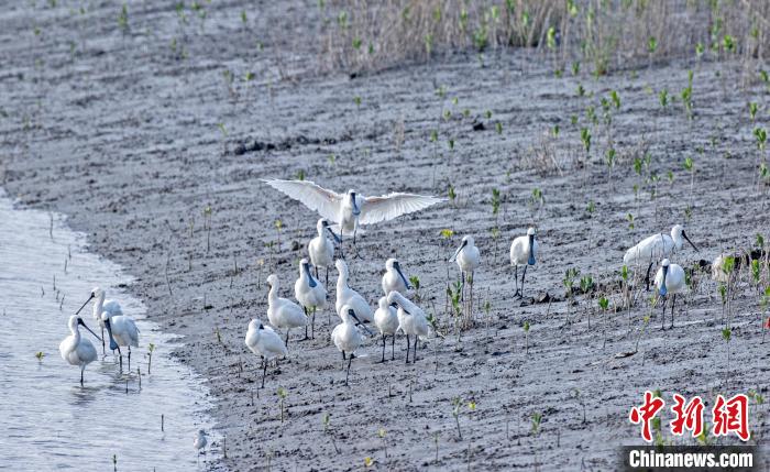 一群黑脸琵鹭在山腰盐场湿地停歇嬉戏。庄绍坤摄