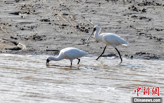 两只黑脸琵鹭在山腰盐场湿地觅食。庄绍坤摄