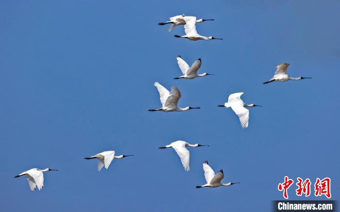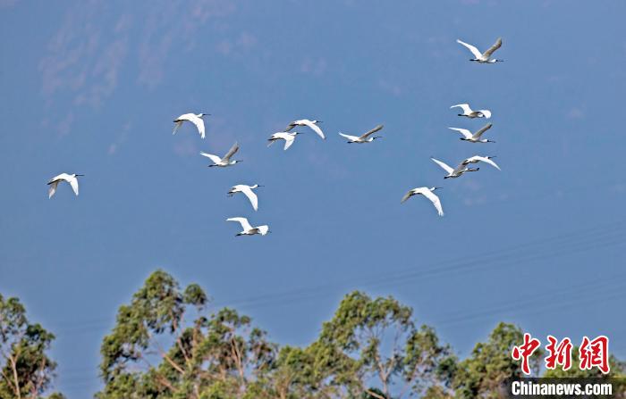 一群黑脸琵鹭在山腰盐场上空翱翔。庄绍坤摄