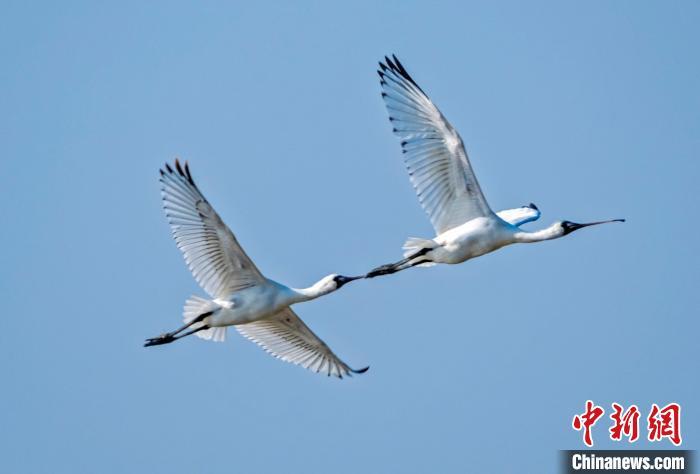 两只黑脸琵鹭在山腰盐场上空翱翔。庄绍坤摄