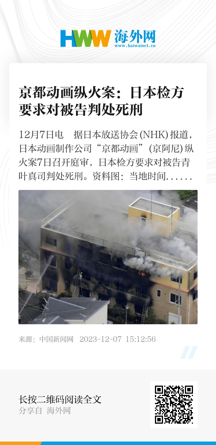 中新网12月7日电 据日本放送协会(NHK)报道,日本动画制作公司“京都动画”(京阿尼)纵火案7日召开庭审,日本检方要求对被告青叶真司判处死刑。