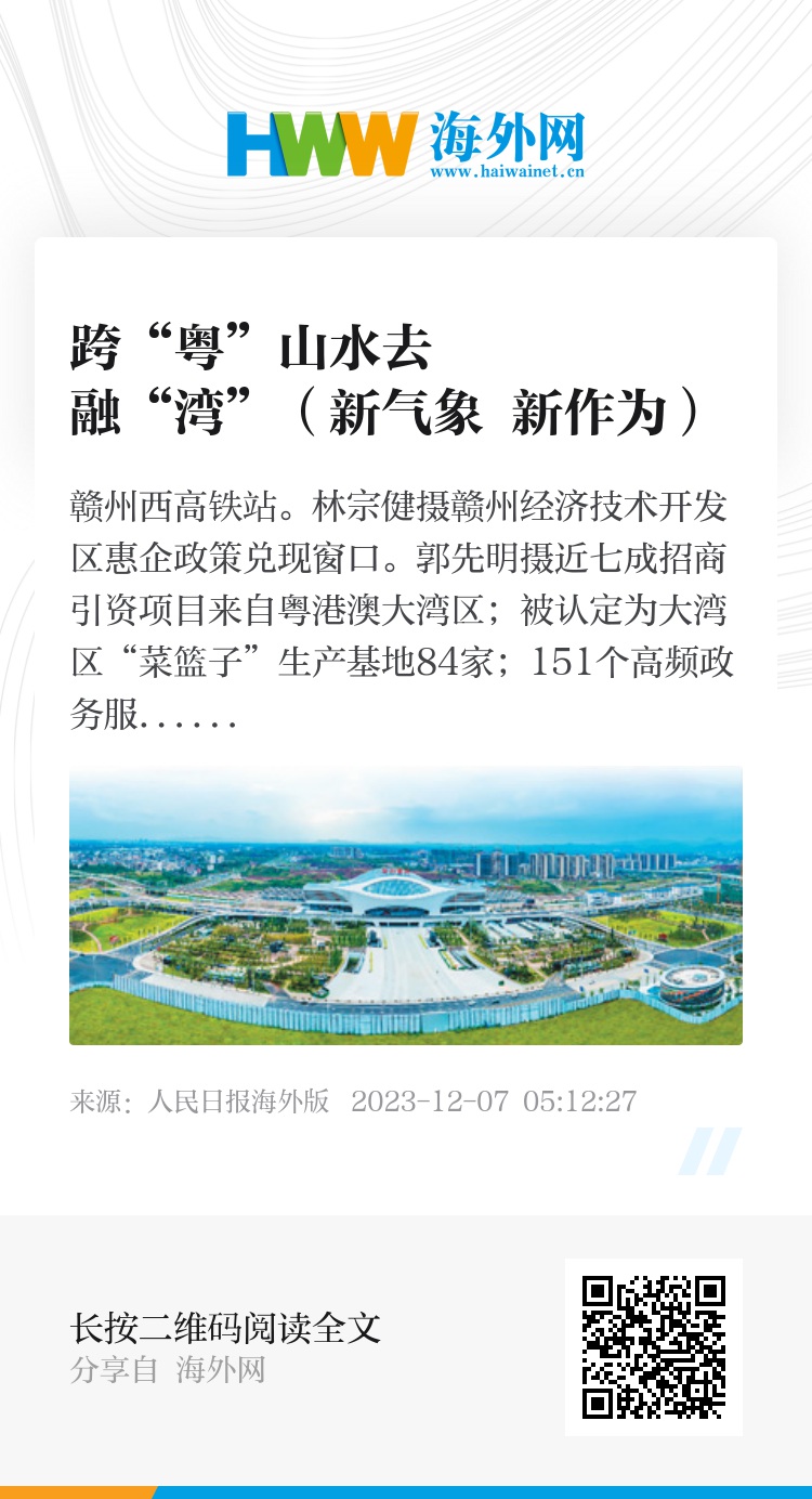 近七成招商引资项目来自粤港澳大湾区;被认定为大湾区“菜篮子”生产基地84家;151个高频政务服务事项实现“跨省通办、一次办成”……一组组亮眼的数据,见证江西省赣州市深度融入粤港澳大湾区的步伐。