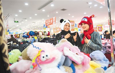 11月26日,消费者在贵州省黔东南苗族侗族自治州从江县一家商店选购帽子。卢忠南摄(新华社发)