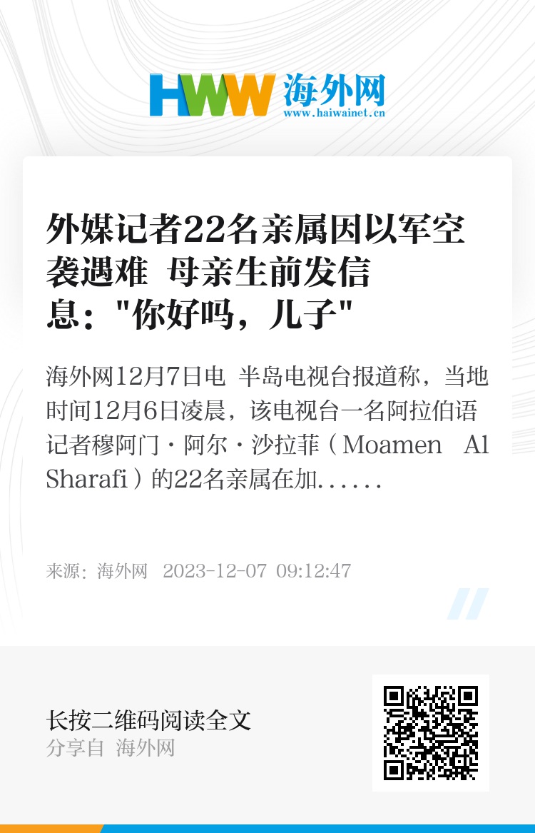 海外网12月7日电 半岛电视台报道称,当地时间12月6日凌晨,该电视台一名阿拉伯语记者穆阿门·阿尔·沙拉菲(Moamen Al Sharafi)的22名亲属在加沙地带的贾巴利亚难民营遭袭遇难。