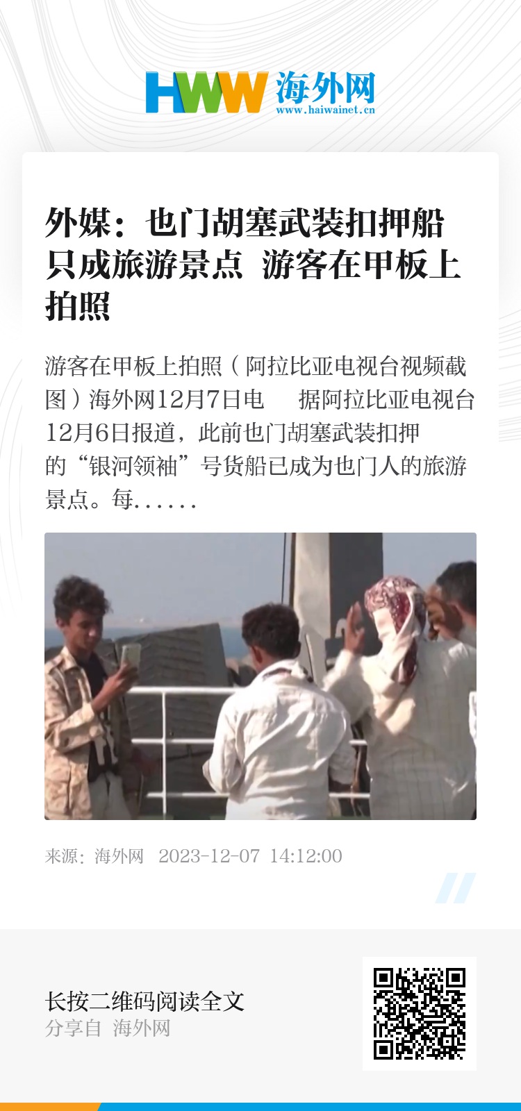 另据也门通讯社援引以色列第12频道的报道称,美国和以色列国旗被铺在船只甲板上。视频画面显示,大量游客在甲板上参观游览并拍照。胡塞武装的媒体官员表示,这艘船已经变成了一个旅游景点。