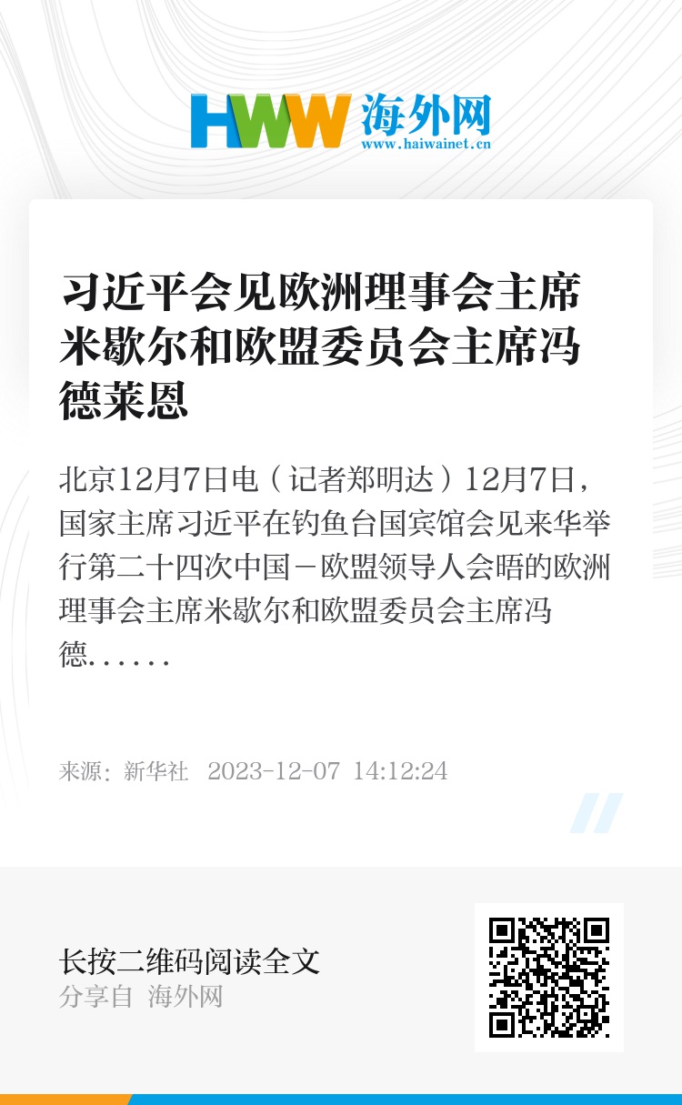 米歇尔和冯德莱恩表示,欧盟和中国是世界两大力量,互为重要经贸伙伴,合作领域日益广泛。欧中合作是互惠平等的,管理好、发展好欧中关系,直接关乎双方人民利益,也关乎世界的繁荣与安全。欧方高度重视同中国的关系,不希望同中国脱钩,期待同中国发展长期稳定、可预测、可持续发展的关系,希望通过此次欧中领导人会晤为未来欧中关系发展注入新的动力。欧方对今年以来欧中各领域高层对话成果感到高兴,认为中国经济长期稳定发展符合欧洲利益,希望双方继续加强经贸、绿色、数字等领域对话与合作,共同努力维护供应链产业链稳定安全,并就气候变化、人工智能等事关人类未来的重大全球性问题加强对话,寻求合作。欧盟坚持奉行一个中国政策。欧方愿同中方本着相互尊重、开放坦诚的态度就分歧问题加强沟通,增进了解。欧中对世界和平稳定负有共同责任、拥有共同利益。欧盟愿同中方密切沟通协作,维护多边主义,维护联合国宪章宗旨和原则,推动解决乌克兰、中东等地区热点问题。