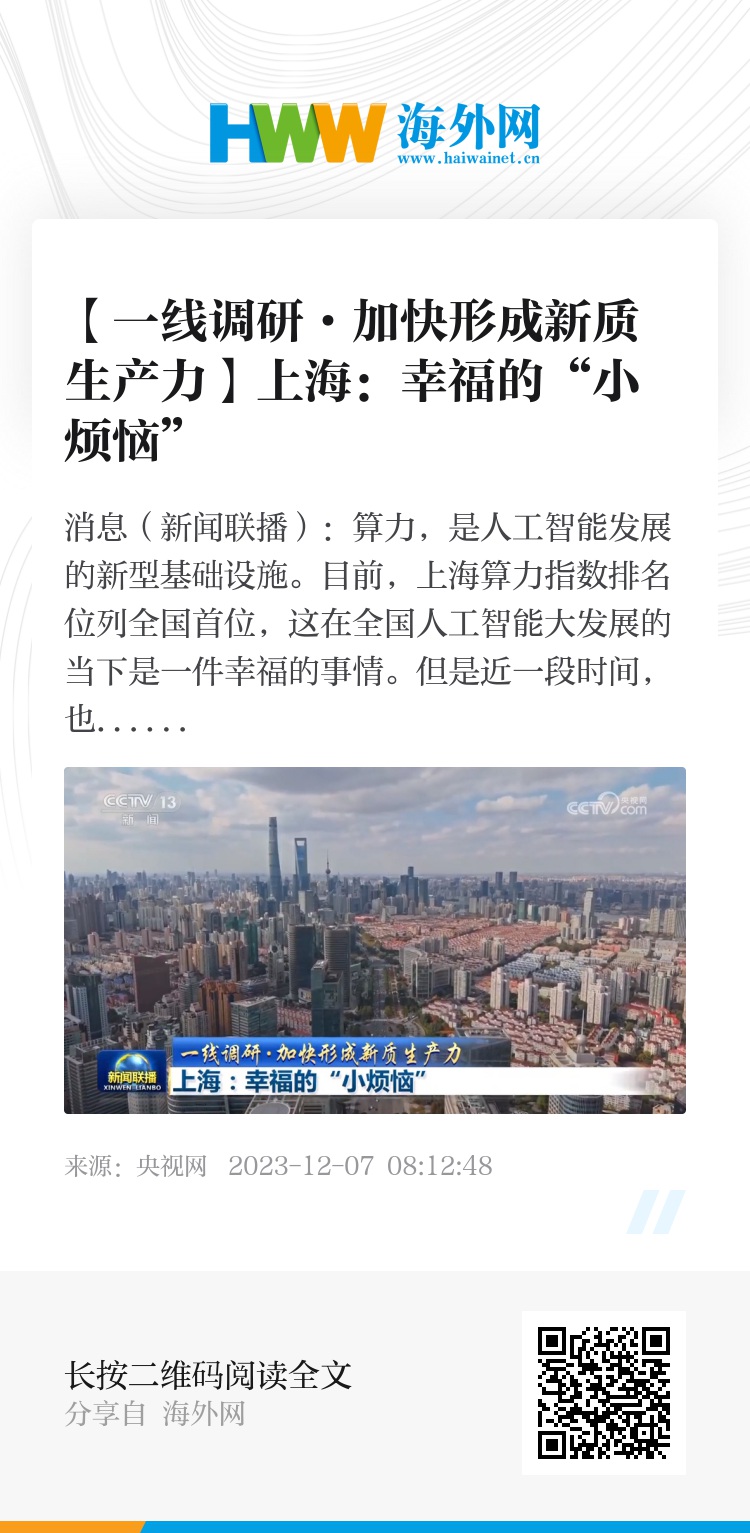 央视网消息(新闻联播):算力,是人工智能发展的新型基础设施。目前,上海算力指数排名位列全国首位,这在全国人工智能大发展的当下是一件幸福的事情。但是近一段时间,也是因为算力,却出现了一些“小烦恼”。这是为什么呢?来看记者的一线调研。