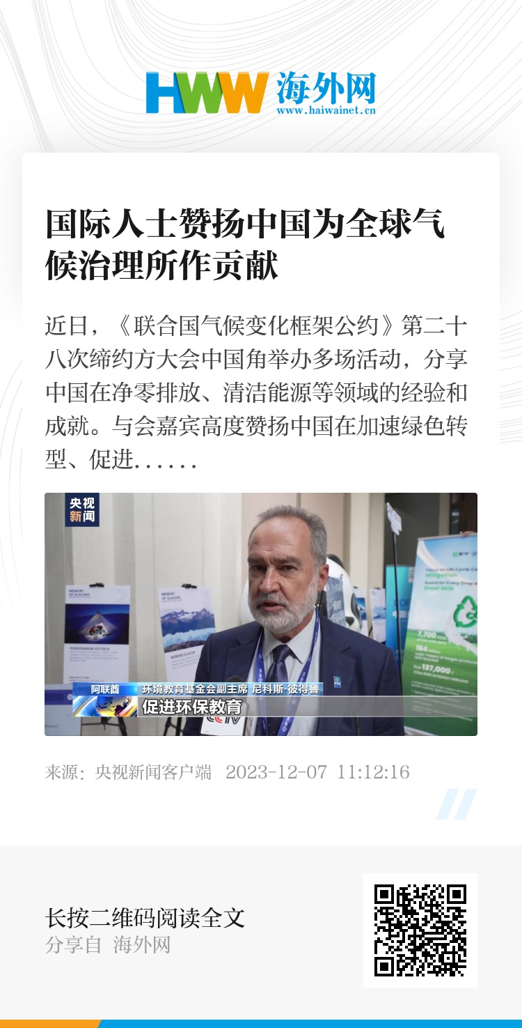 环境教育基金会副主席 尼科斯·彼得鲁:促进环保教育,我认为这是非常重要的事,保护冰川非常重要,应当动员国际社会的方方面面,中国在这方面做得非常好。