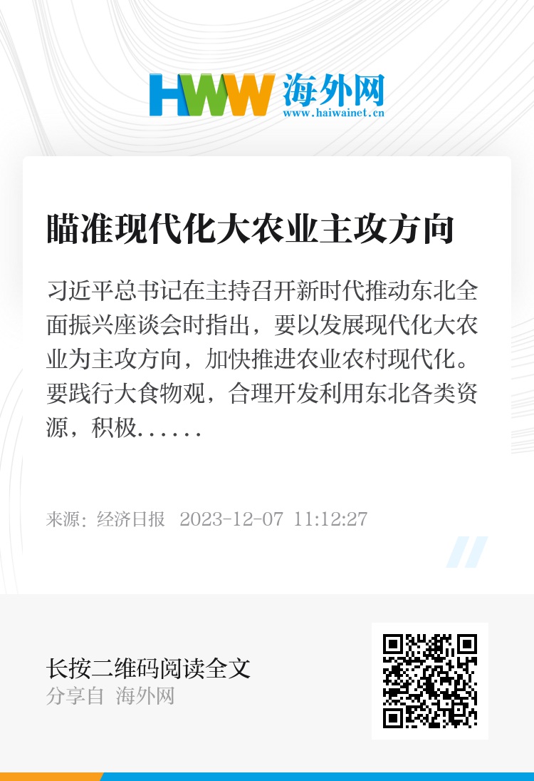 习近平总书记在主持召开新时代推动东北全面振兴座谈会时指出,要以发展现代化大农业为主攻方向,加快推进农业农村现代化。要践行大食物观,合理开发利用东北各类资源,积极发展现代生态养殖,形成粮经饲统筹、农林牧渔多业并举的产业体系,把农业建成大产业。