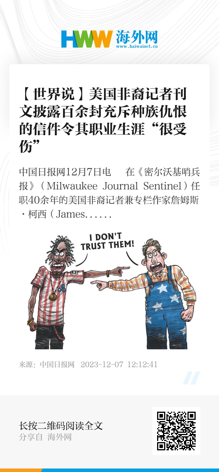 中国日报网12月7日电 在《密尔沃基哨兵报》(Milwaukee Journal Sentinel)任职40余年的美国非裔记者兼专栏作家詹姆斯·柯西(James E. Causey)日前在《今日美国》(USA TODAY)刊文表示,带有种族主义仇恨内容的读者信件和留言几乎伴随了他的记者生涯,并表示相信不少美国非裔记者都有过类似经历。