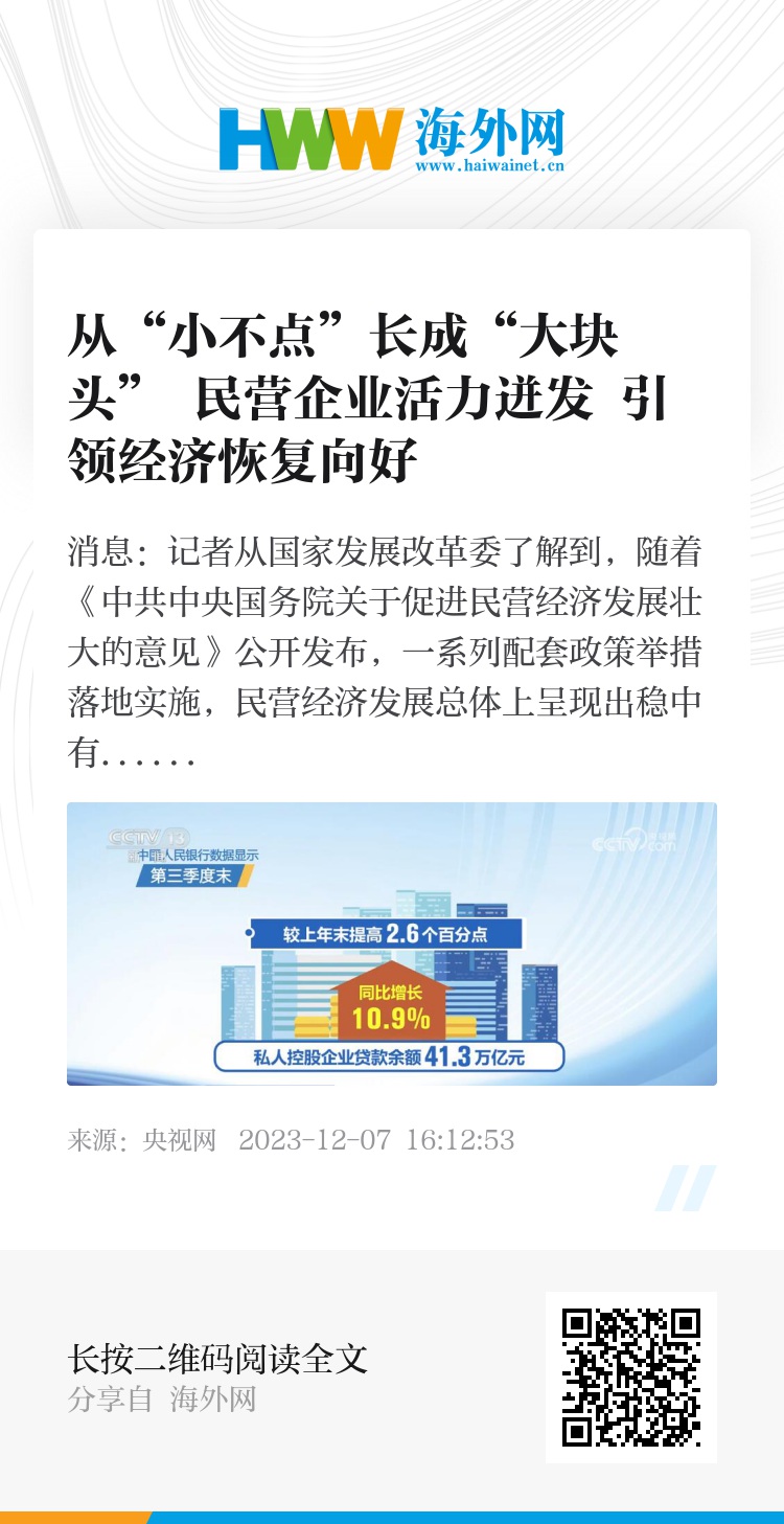 一方面,民营企业扎根生长的巨大潜力进一步释放。国家统计局面向5.9万户小微企业开展的调查显示,民营企业生产订单情况、经营情况总体改善,景气指数环比提升1.5个百分点。中国中小企业协会数据显示,三季度中国中小企业发展指数重回上升区间,多个分项指数和分行业指数上升明显,是引领经济恢复向好最活跃的经营主体之一。民营经济是感知经济趋势最具敏锐度、引领经济向好最具创造力的生力军,越来越多的民营企业从不起眼的“小不点”长成担大任的“大块头”,涌现一批“小巨人”“隐形冠军”甚至世界一流企业,30家左右民营企业进入世界500强行列。