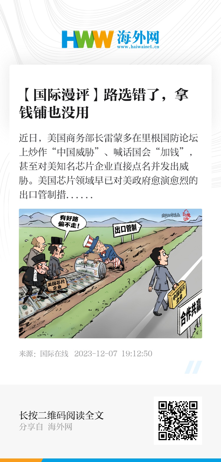 近日,美国商务部长雷蒙多在里根国防论坛上炒作“中国威胁”、喊话国会“加钱”,甚至对美知名芯片企业直接点名并发出威胁。美国芯片领域早已对美政府愈演愈烈的出口管制措施怨声载道。雷蒙多公开喊话要钱,恰恰暴露了华盛顿内部在实施遏华措施上举步维艰。美国滥用出口管制措施违背自由贸易市场规则、原则和规律,注定失败,加再多钱,也没用。