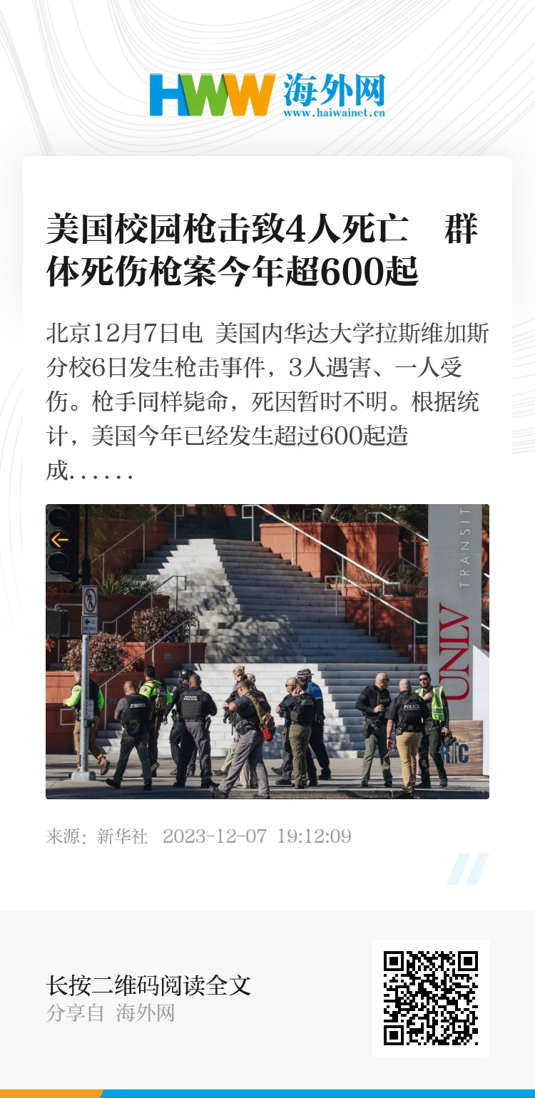 新华社北京12月7日电 美国内华达大学拉斯维加斯分校6日发生枪击事件,3人遇害、一人受伤。枪手同样毙命,死因暂时不明。