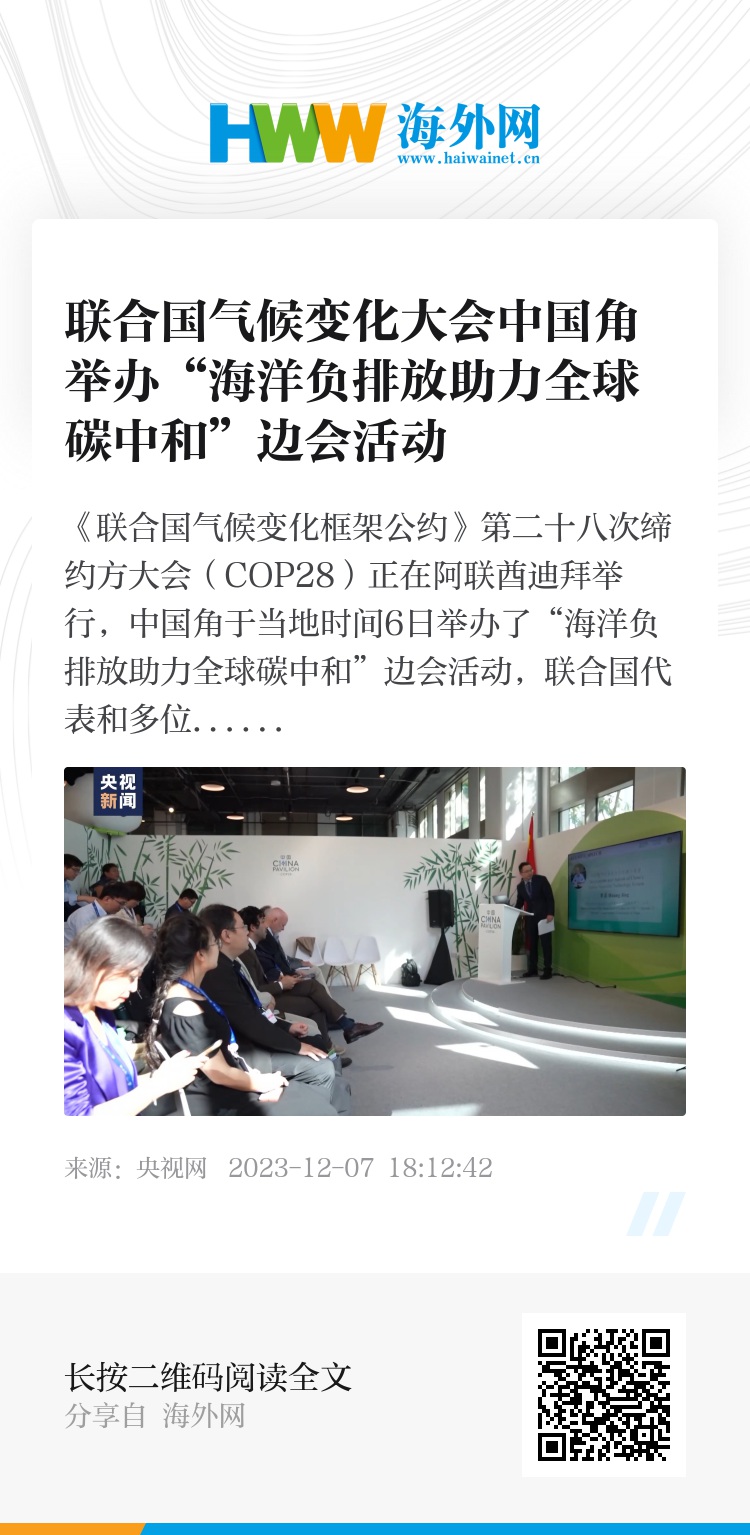 《联合国气候变化框架公约》第二十八次缔约方大会(COP28)正在阿联酋迪拜举行,中国角于当地时间6日举办了“海洋负排放助力全球碳中和”边会活动,联合国代表和多位中外学者就如何通过海洋负排放实现碳中和进行了充分交流。