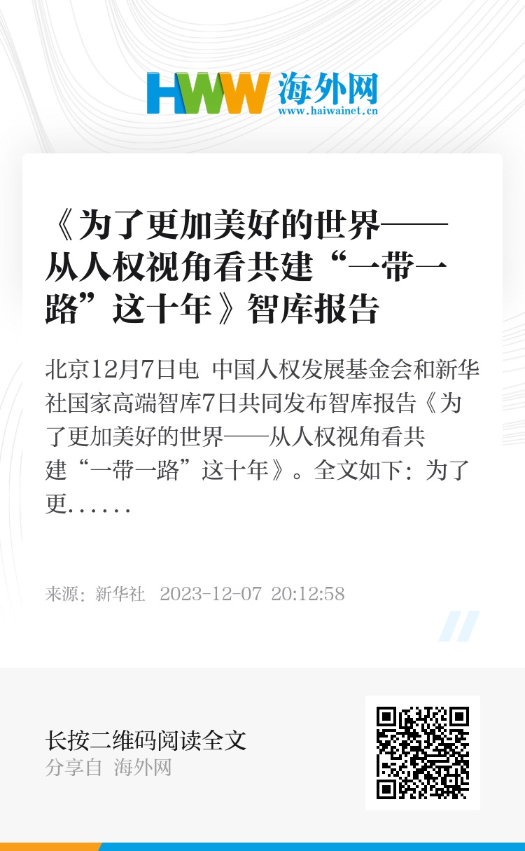 新华社北京12月7日电 中国人权发展基金会和新华社国家高端智库7日共同发布智库报告《为了更加美好的世界——从人权视角看共建“一带一路”这十年》。全文如下: